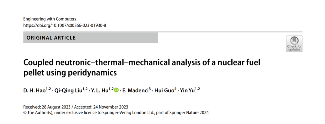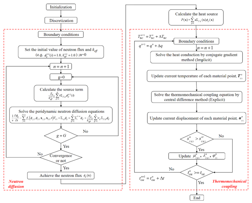 本研究介绍了一种使用基于状态的近场动力学(PD)理论模拟核燃料芯块破裂行为的综合方法。与现有的燃料芯块热力学模型不同,这种新的多物理框架耦合了中子扩散、传热和机械变形。首次提出了多群中子扩散分析的PD形式,并与PD热力学分析相结合。PD中子扩散系数是根据传统的中子扩散系数求出的。采用源迭代法求解多组中子扩散的PD型方程,保证了数值的稳定性和收敛性。这种方法证明了它在捕捉中子扩散的复杂行为方面的有效性。它进一步扩展到分析AP1000核反应堆的晶格单元,考虑中子燃料和功率密度的不均匀分布,以进行机械损伤的综合评估。这种多物理耦合方法增强了对燃料芯块裂解的理解,并促进了先进反应堆安全策略的发展。