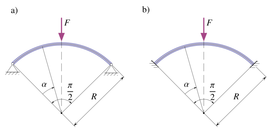 图:静态横向荷载下的弧形梁。(a) 简支梁,(b)夹紧梁。