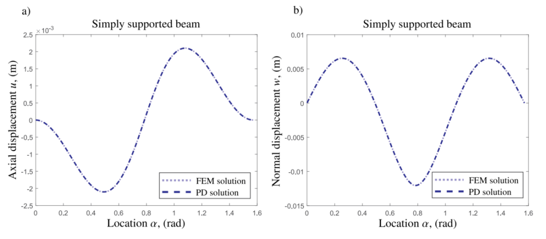 图:静载荷作用下简支圆弧梁的位移与轴向位置。(a) 轴向位移,(b)法向位移。