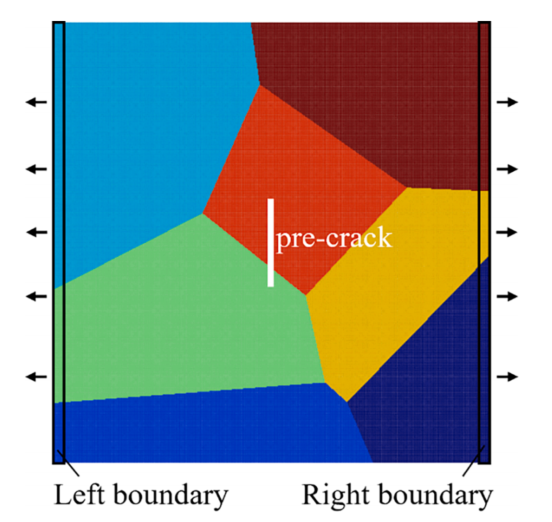 图:通过移动左右边界进行单轴拉伸的预裂多晶石墨烯样品。不同的颜色代表样品中不同的颗粒。