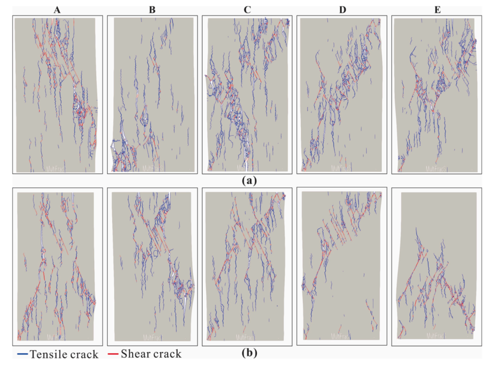 图:(a)普通煤和(b)具有方解石颗粒的煤在不同围压(a)0.5 MPa、(b)1.0 MPa、(C)2.0 MPa、(D)3.5 MPa和(E)5.0 MPa的约束压缩下的破裂模式。