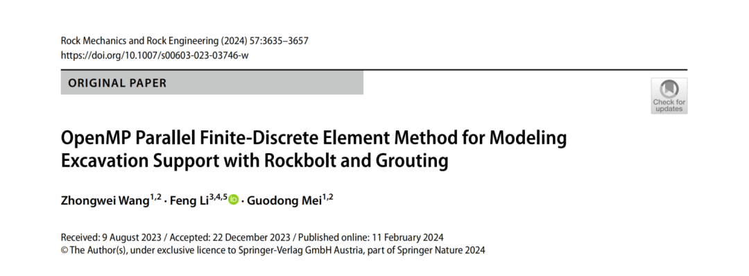 在过去,CPU内核/线程的数量通常小于8/16;现在,最大数量是128/256。作为一种基于CPU的并行方法,随着CPU内核和线程的增加,OpenMP具有越来越大的优势。利用OpenMP实现了一种用于地下开挖和岩石加固建模的并行组合模糊离散元方法。它的计算性能在两个先进的CPU中得到了验证:AMD Ryzen Threadipper PRO 5995WX(64/128核/线程);和2×AMD EPYC 7T83(128/256核/线程)。然后,使用新的固体锚杆模型实现了其在锚杆-喷射混凝土-灌浆支护下模拟隧道开挖的能力,该模型可以明确地捕捉锚杆、灌浆和岩石之间的相互作用。单轴压缩试验的并行性能验证表明:(i)对于加速比,基于OpenMP的并行FDEM在Threadipper上获得了30(33k元素)和41(3304k元素)的最大加速比,在2×EPYC上分别获得了31和43;(ii)对于加速比的可扩展性,当使用的线程数小于128时,加速比总是随着线程数的增加而增加;(iii)对于加速比的稳定性,无论岩石是破裂前还是破裂后,它都具有稳定的加速比。