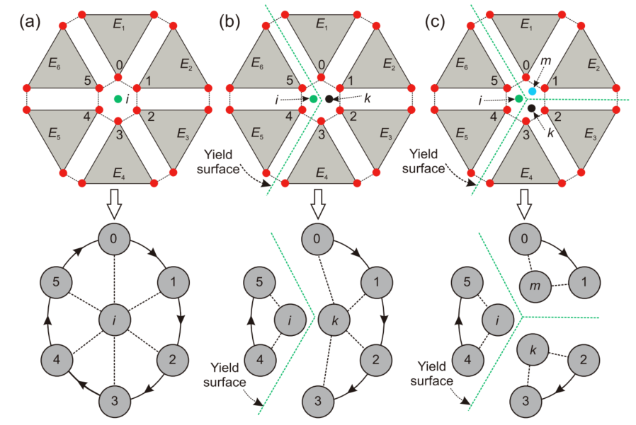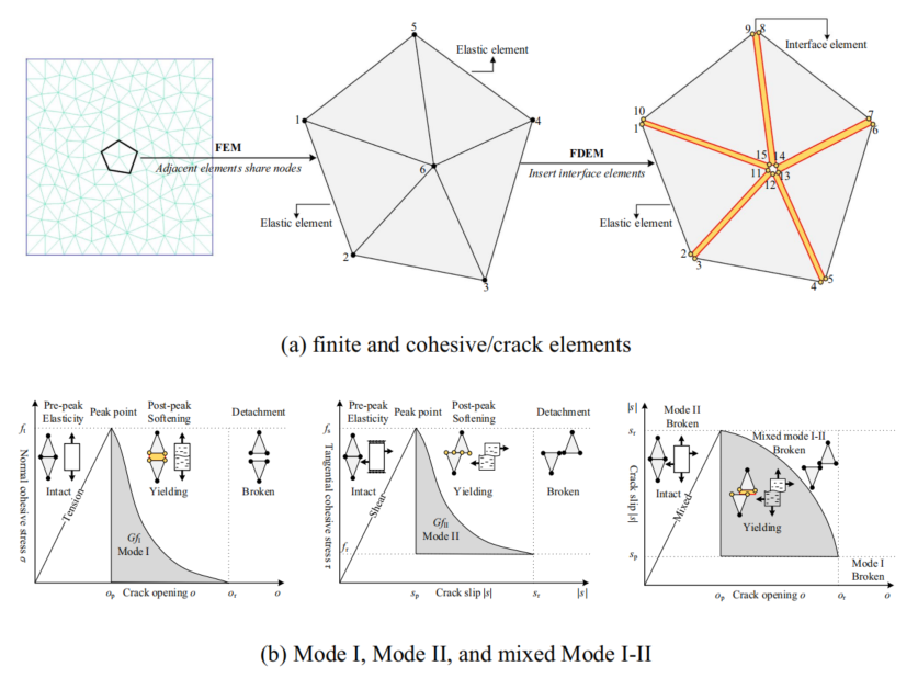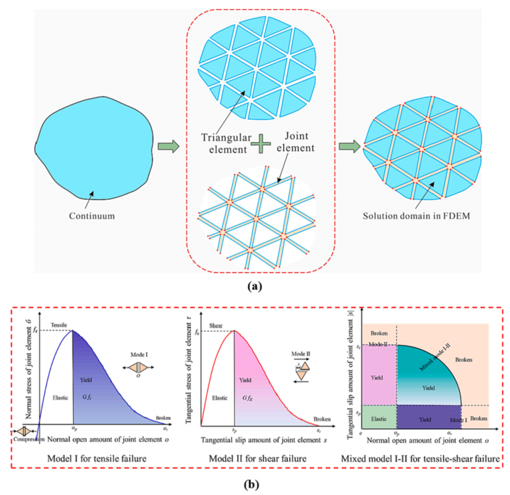 图:FDEM的基本思想(a)三角形单元和节理单元之间连续体和连接关系的求解(b)继Munjiza等人之后的节理单元的三种类型的断裂本构模型。