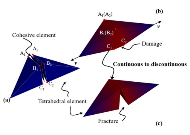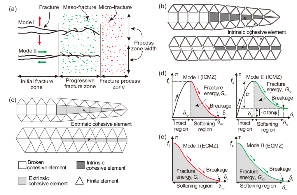 图:分别在dFDEM和cFDEM中进行材料压裂建模。(a) 脆性材料断裂尖端前FPZ(断裂过程区)发展的概念模型。