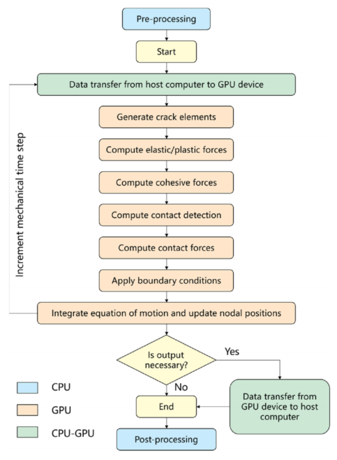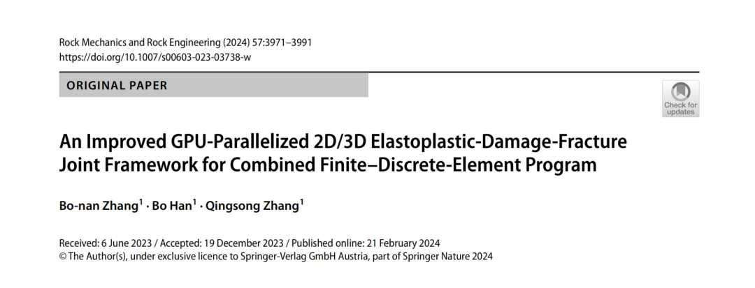 有限元-离散元组合法(FDEM)在模拟脆性材料的断裂和碎裂过程方面显示出显著的优势。然而,单独使用简单的弹性损伤模型无法满足模拟具有延性材料变形的要求,而且离散单元的计算成本使其成为FDEM进一步发展的瓶颈。在这项工作中,提出了三维弹塑性损伤-断裂接头力学模型,并在新的FDEM软件包——跨学科有限元-离散元程序(INFIDEP)中实现了一种组合算法。为了提高计算效率和规模,使用C/C++中的计算统一设备体系结构(CUDA)开发了通用图形处理单元(GPGPU)并行化INFIDEP代码。提出了一种改进的并行框架,并采用了一种对非均匀单元更具鲁棒性的简化接触检测算法。使用GPGPU-INFIDEP,我们模拟了巴西在准静态载荷条件下的拉伸强度(BTS)试验和泰勒杆冲击试验。BTS测试显示了一致的应力-应变曲线和准确的变形趋势。在NVIDIA A6000 GPU平台上,加速比稳定在400–500倍左右。基于接头力学模型模拟的Taylor杆冲击试验很好地反映了试件头部的变形趋势和冲击断裂模式,这是传统FDEM和2D平面应变模型无法模拟的。这些结果表明,GPGPU-INFIDEP为研究岩石工程中脆性和弹塑性材料的连续-不连续变形问题提供了一个有价值且强大的数值工具。