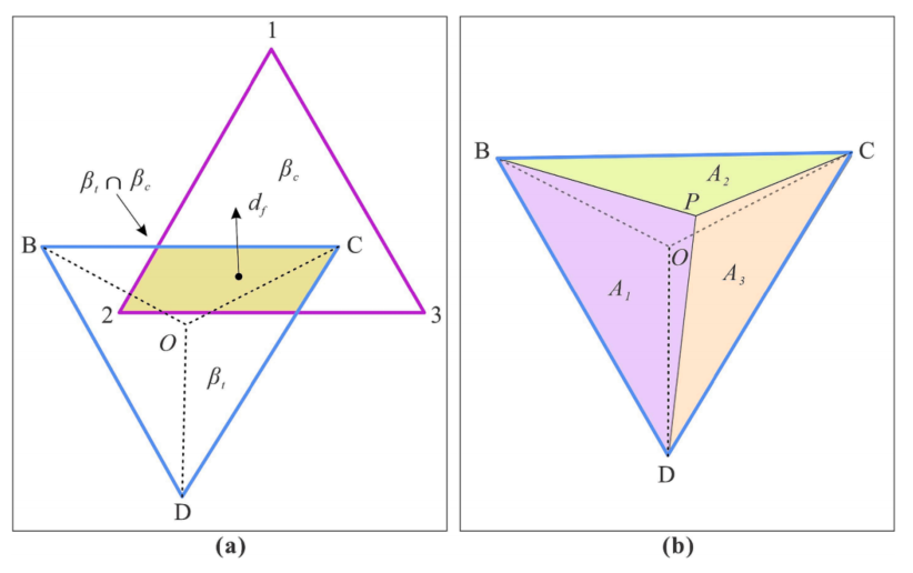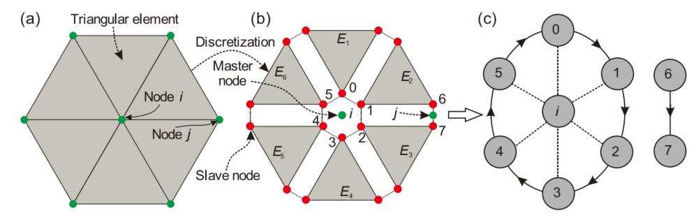 图:(a) 三角形单元之间的接触力和(b)三角形单元内任何点的势的解。