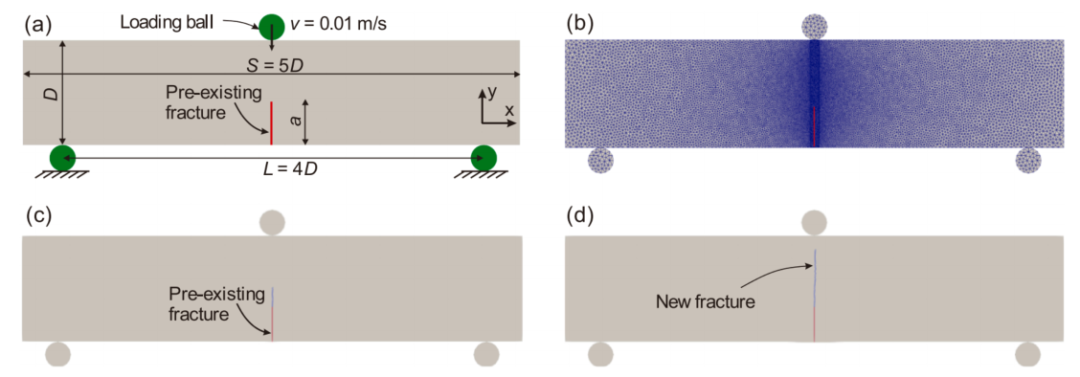 图:(a) 对称三点弯曲试验模型的几何结构和(b)网格。在所提出的cFDEM中模拟的对称三点弯曲试验中不同时间戳下的断裂模式。