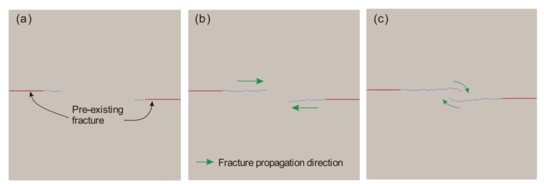 图:在三个不同时间戳下,在所提出的cFDEM中模拟的双缺口不对称拉伸试验中的断裂模式演变。