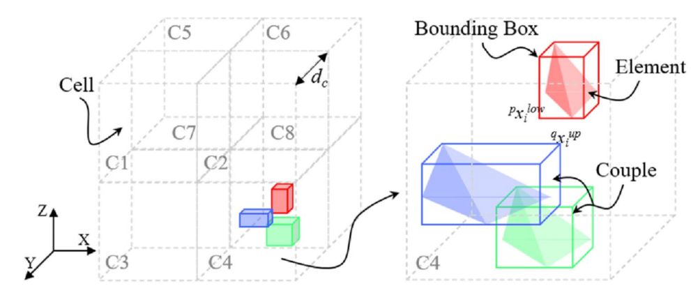 图:三个离散的四面体元素与边界盒位于区域细分为8个单元。