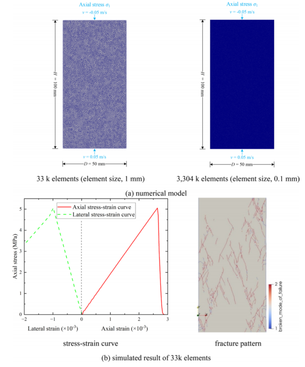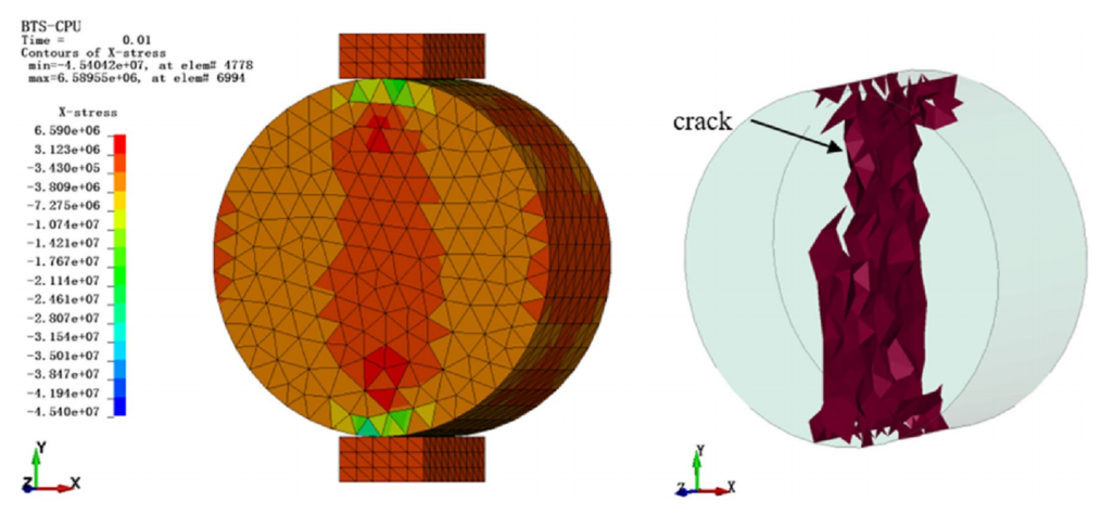 图:使用CPU FDEM计算的BTS试验模型中0.01 s加载时的应力场等值线图和失效后的裂纹分布。