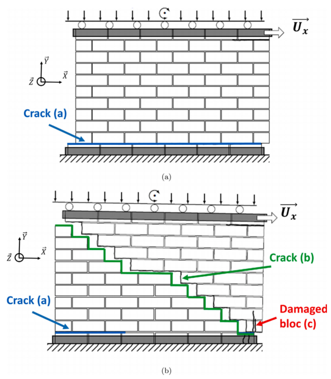 图:试验墙的失效机制:(a)施加的压缩应力较低;(b)施加的压应力较高。