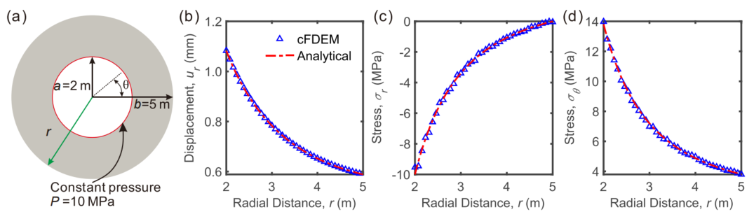 图:(a) 空心厚壁圆筒的几何模型。解析解与cFDEM模拟结果之间圆柱体中(b)径向位移、(c)径向应力和(d)切向应力分布的比较。