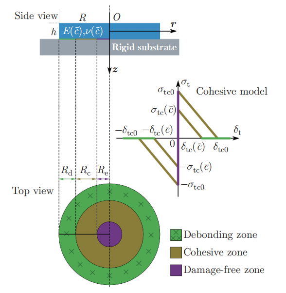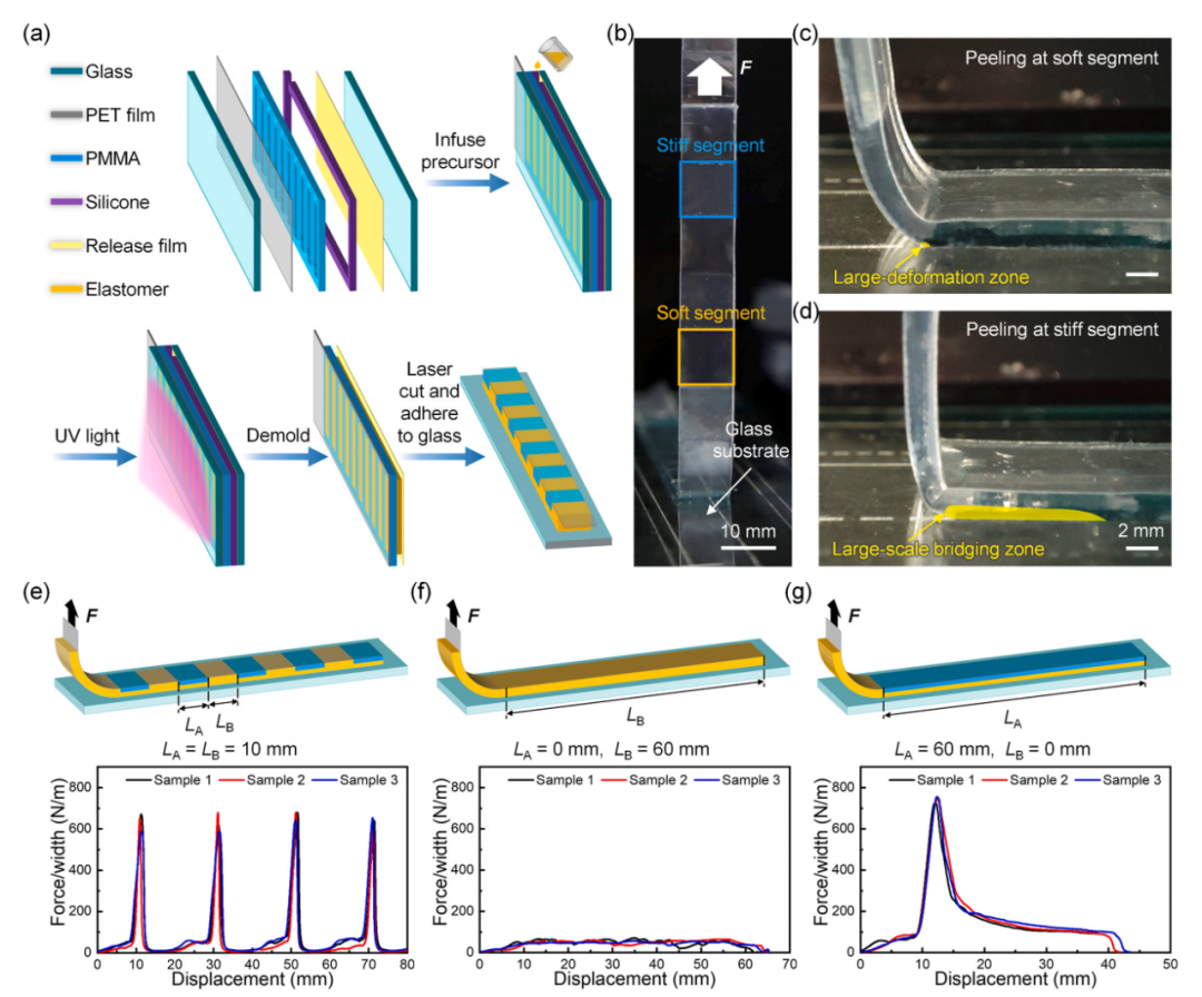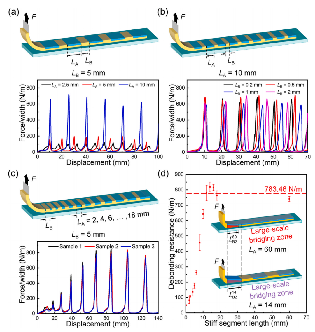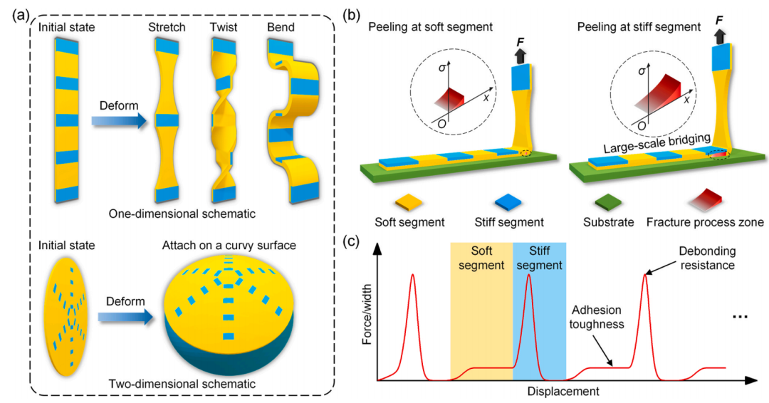 图:具有高抗脱粘性的可拉伸非均质粘合剂的原理。(a) 显示一维/二维可拉伸粘合剂变形的示意图。(b) 以90为准◦ 剥离时,由于较小的局部断裂过程区,软段的抗剥离性较低,而由于较大的弯曲刚度和较大的桥接区,硬段的抗脱粘性显著增强。(c) 非均质粘合剂的典型力/宽度与位移的关系曲线。