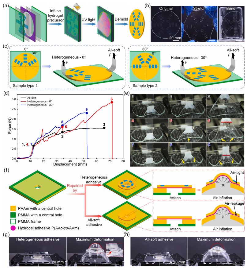 图:可拉伸非均质粘合剂在伤口修复中的应用。