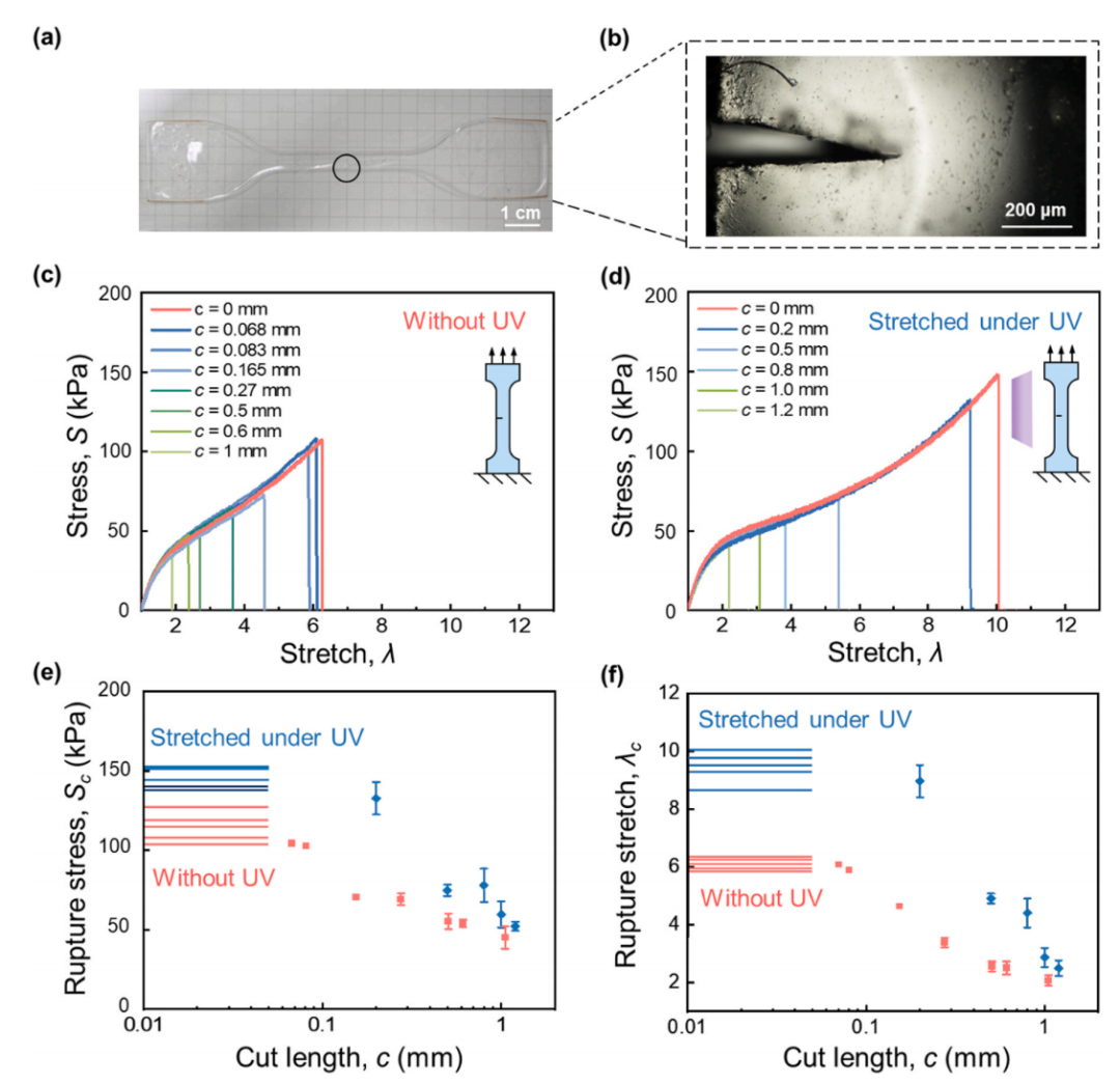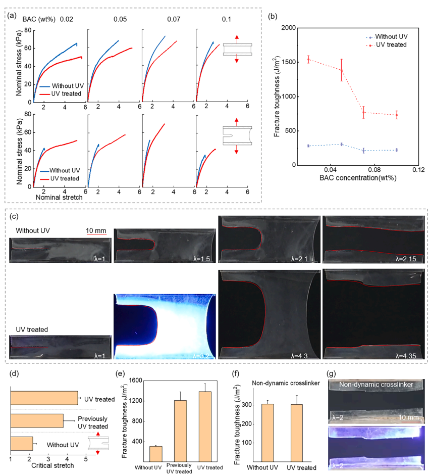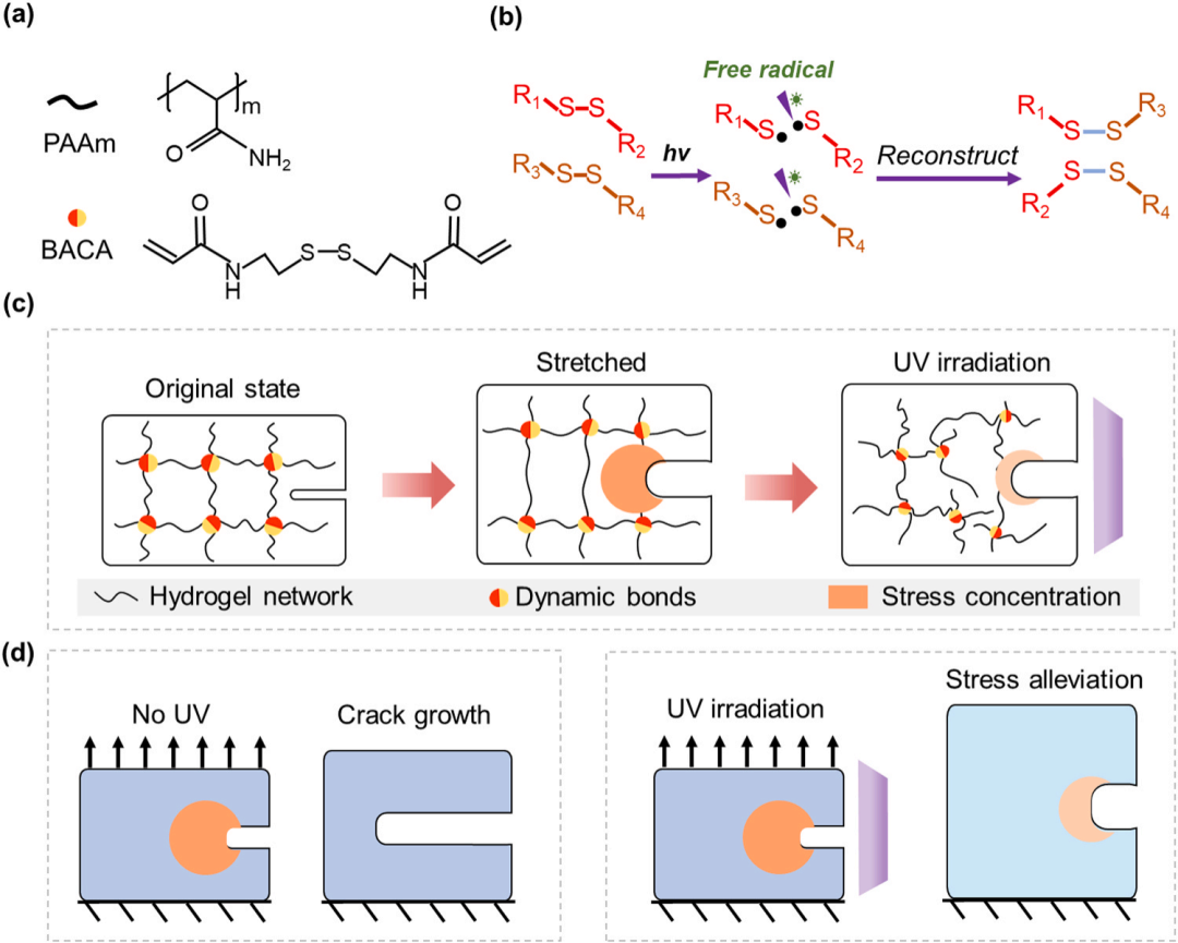 图:具有动态共价键的水凝胶的缺陷敏感性。(a) PAAm链的化学结构,以及具有二硫键的交联剂BACA。(b) 二硫键交换反应示意图。在紫外线照射下,二硫键会随机断裂和重建。(c) 当预切割的水凝胶被拉伸时,应力集中在裂纹尖端附近。在紫外线照射下,应力链在裂纹尖端附近重新排列,应力松弛。(d) 预切割的动态水凝胶在紫外线照射下比没有紫外线照射下可以拉伸得更多。