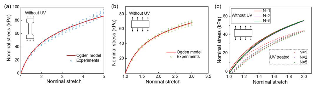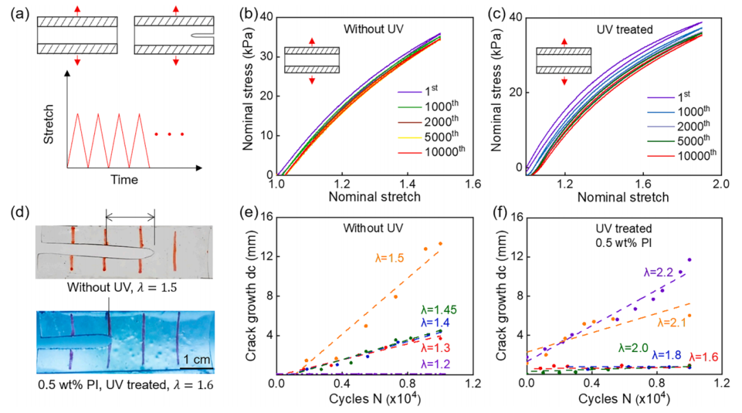 在软材料中,具有动态键的水凝胶可以被一系列刺 激激活,包括温度、pH、红外或紫外光,构成了一类特殊的材料,具有不寻常的性能,如自修复、致动和可控降解。在这里,我们以具有可重构二硫键交联的水凝胶为例,研究其力学行为。我们证明,当二硫化物交联被紫外线照射激活时,该材料具有优异的抗断裂和疲劳性能。我们提出了一个简单的本构模型,描述了材料在各种条件下的力学行为。