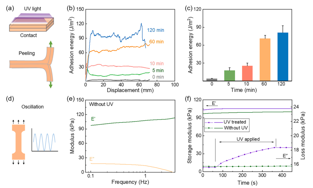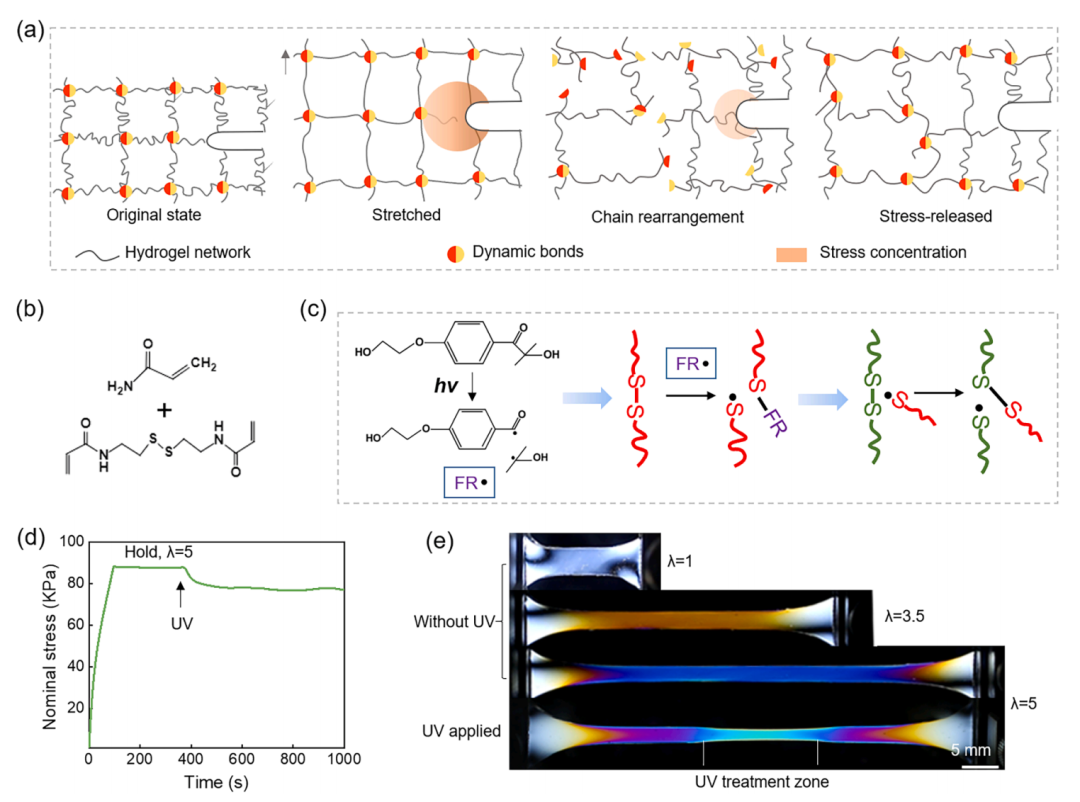 图:动态粘合和应力消除。(a) 动态键重配置和应力释放的说明。(b) 以AAm为单体,BAC为交联剂合成了水凝胶。(c) 紫外线照射形成的自由基攻击二硫键,破坏和重整交联。(d) 应力-时间曲线显示了在紫外线照射下的应力松弛。(e) 使用偏振光显示应力轮廓的拉伸试样的双折射图像。