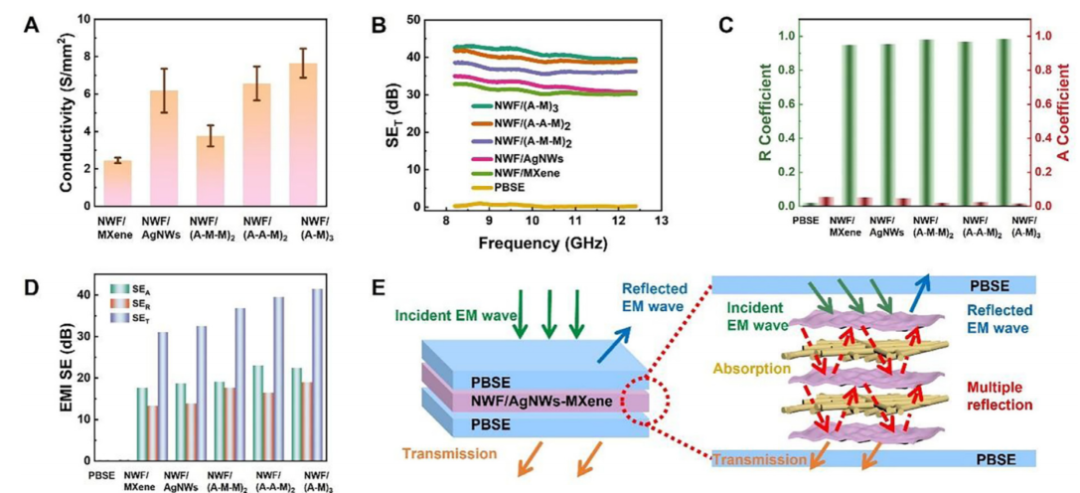 图:多孔导电NWF/AgNWs MXene/PBSE夹层复合材料的EMI屏蔽能力。