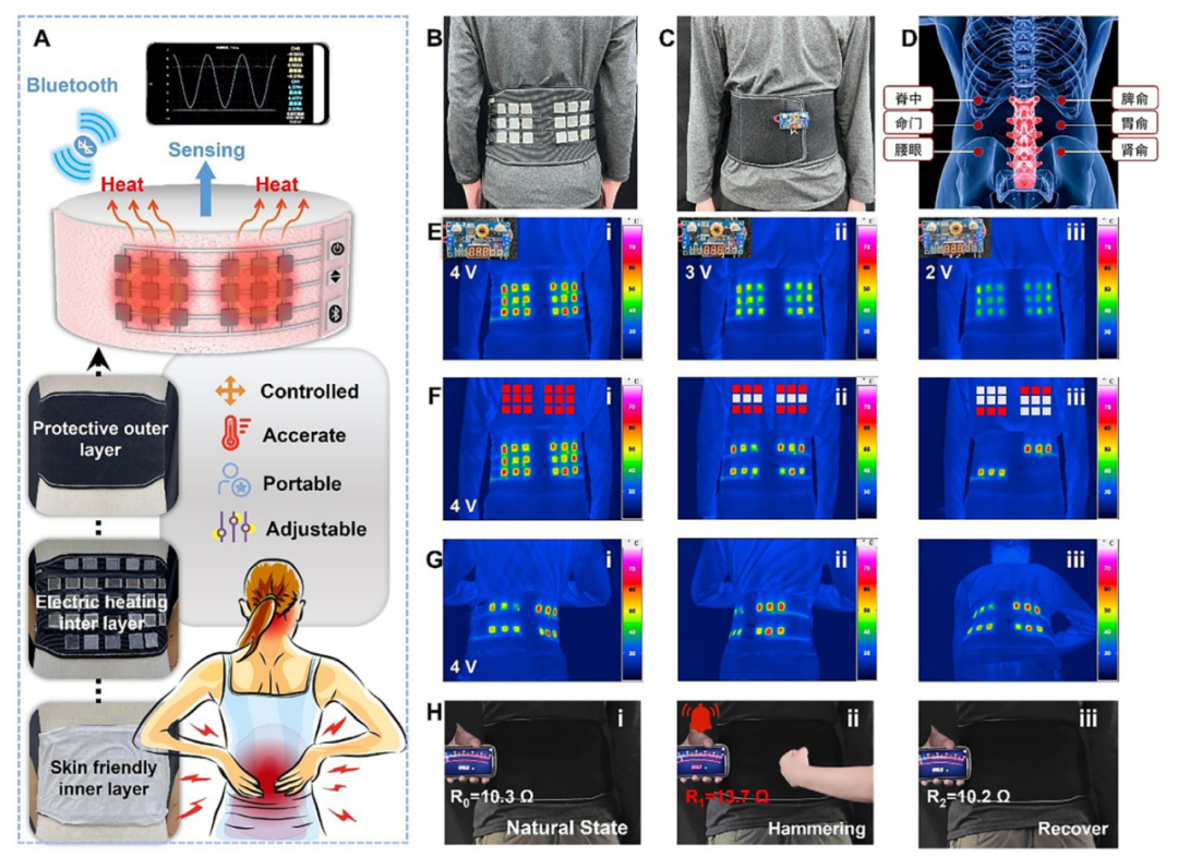 图:基于BLE的多功能皮带,具有传感、抗冲击和热管理功能。(A) 具有精确热管理和BLE抗冲击传感功能的三层多功能皮带示意图。(B) 志愿者佩戴的腰带背面焦耳加热区域的光学图像。(C) 志愿者佩戴的皮带的正面照片,该皮带有一个前口袋用于存放电池,外部有一个数字电压调节器模块,用于在多个水平上调节温度。(D) 人体背部穴位图。(E) 通过可调电压模块(2-4 V)控制不同温升的皮带红外成像。(F) 红外成像带的固定加热区域由多分支和开关控制设计。(G) 通过内置电源和可控电路实现便携式运动皮带的红外成像。(H) BLE感应带的光学图像,具有脉冲电阻信号监测和过度用力报警功能。