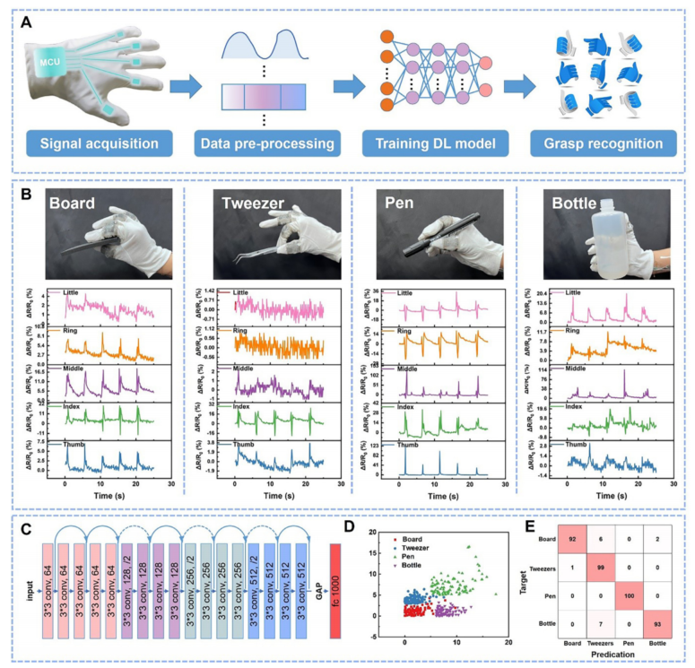 图:基于深度学习的BLE传感手套,用于抓握动作识别。(A) 抓握动作识别系统的总体结构和数据流。(B) 感应手套采集的不同抓握动作的光学图像和相应的阻力信号。(C) 信号分类模型的结构。(D) 深度学习后根据四个抓取动作嵌入t-SNE的聚类图像。(E) 信号分类模型的混淆矩阵。