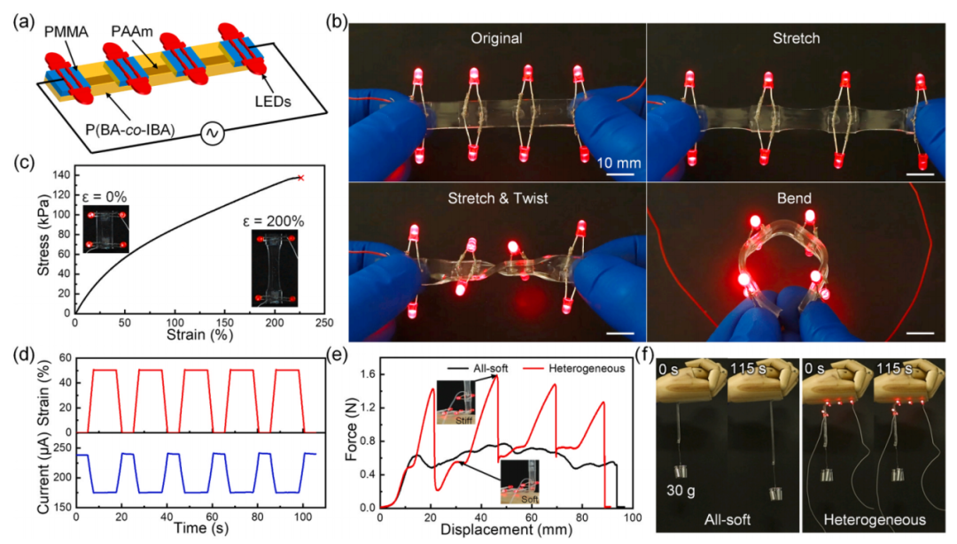 图:可拉伸异构粘合剂在可拉伸电子产品中的应用。
