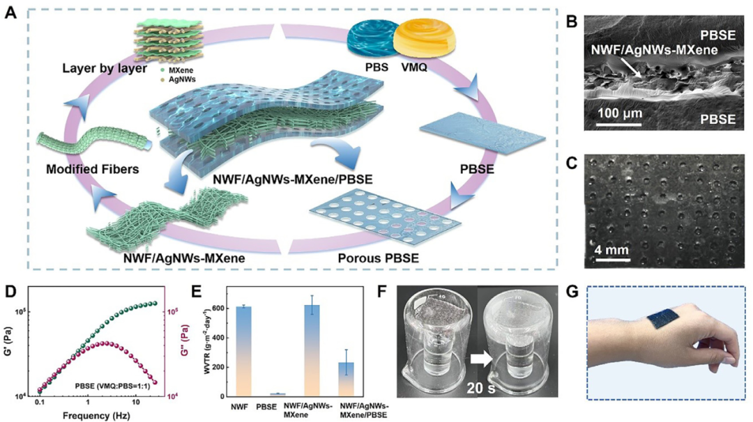 图:透气、柔性和保形多孔导电NWF/AgNWs MXene/PBSE夹层复合材料的制备。(A) 多孔导电NWF/AgNWs-MXene/PBSE夹层复合材料的制备工艺示意图。(B) NWF/AgNWs MXene/PBSE的SEM图像(横截面)。(C) NWF/AgNWs MXene/PBSE的光学图像(俯视图)。(D) PBSE的储能模量(G')和损耗模量(G'')。(E)不同样品的水蒸气透过率(WVTR)的比较图。(F) 穿过可透气NWF/AgNWs MXene/PBSE的热水蒸汽的光学图像。(G)粘合剂和保形NWF/AgNW MXene/PBS的光学图像。