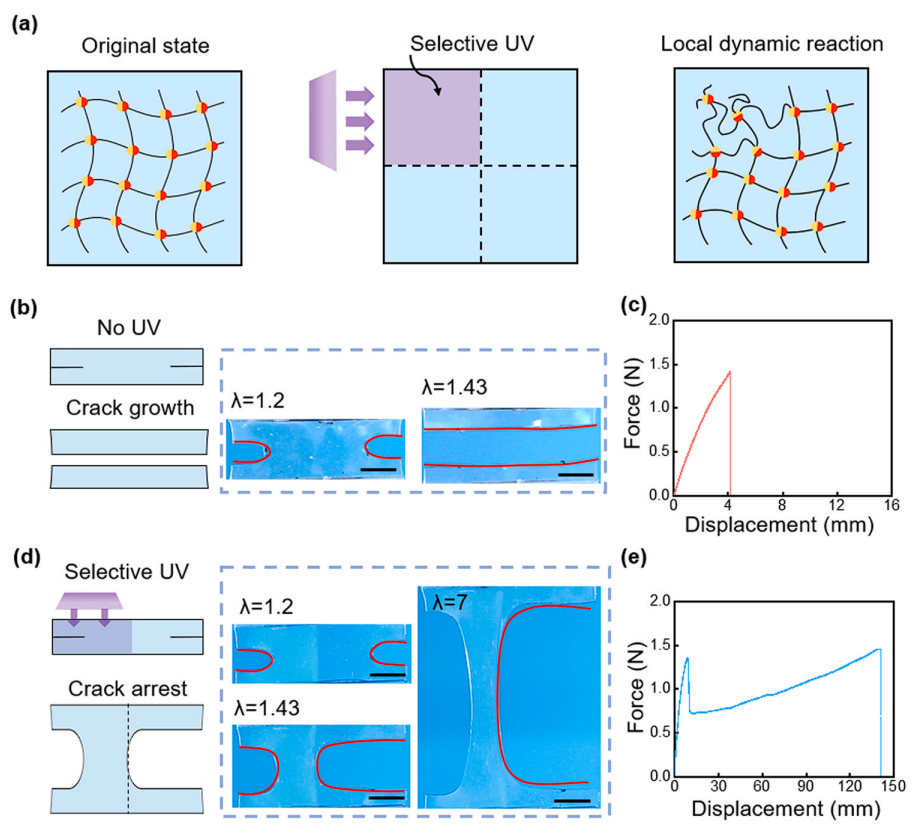 图:通过选择性紫外线照射调节动态水凝胶的裂纹扩展。