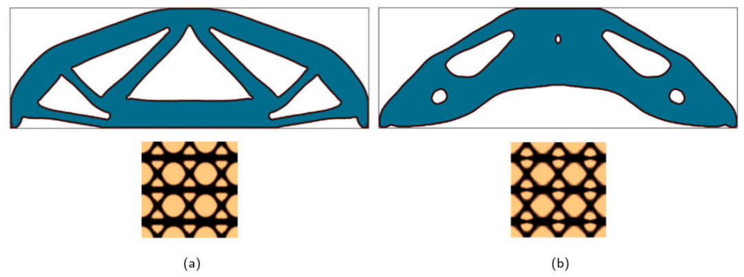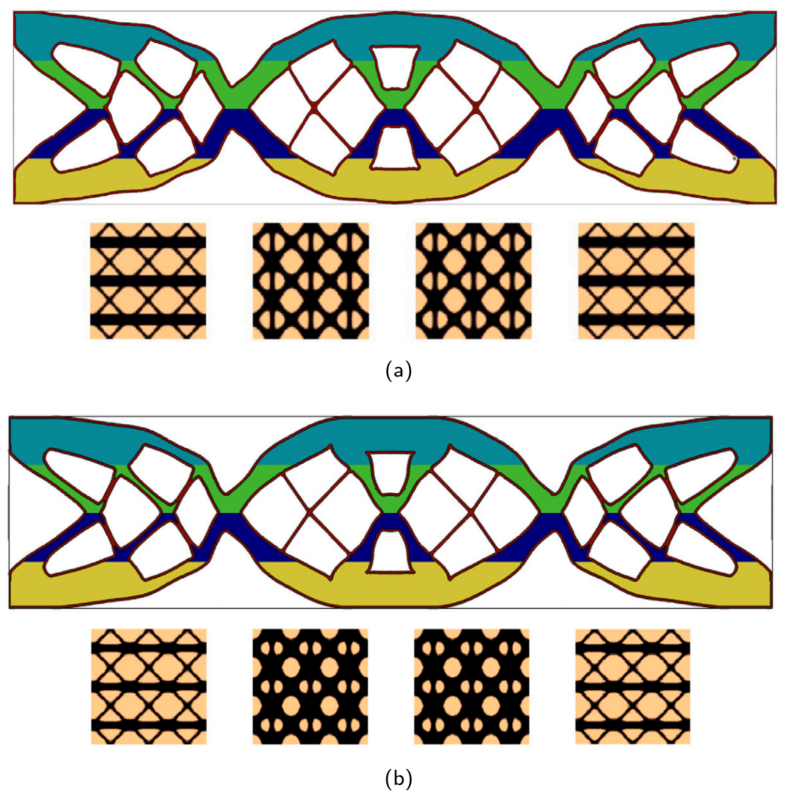图:填充四层晶格微观结构的夹端梁的宏观和微观优化结果,其中(a)宏观单元网格:400×100,微观单元网格:40×40;(b) 宏观单元网格:800×200,微观单元网格:50×50。