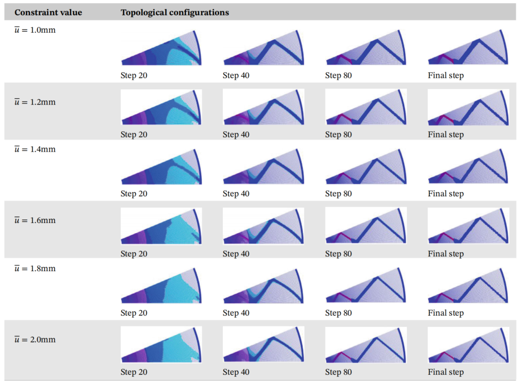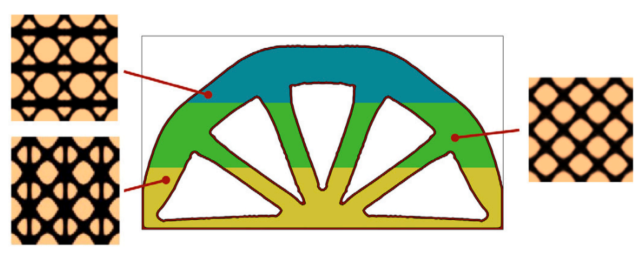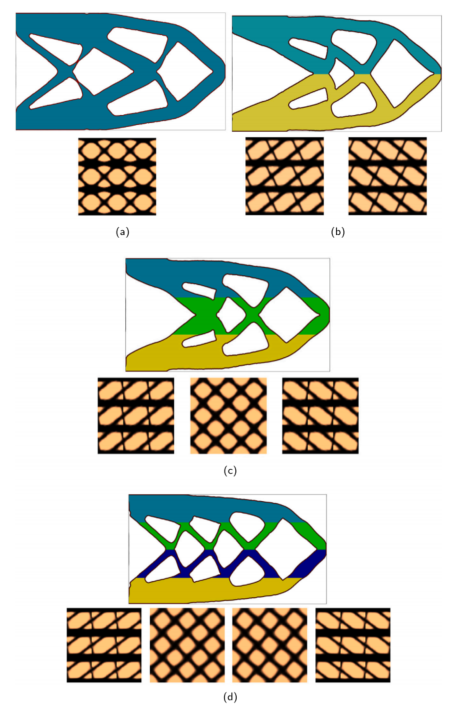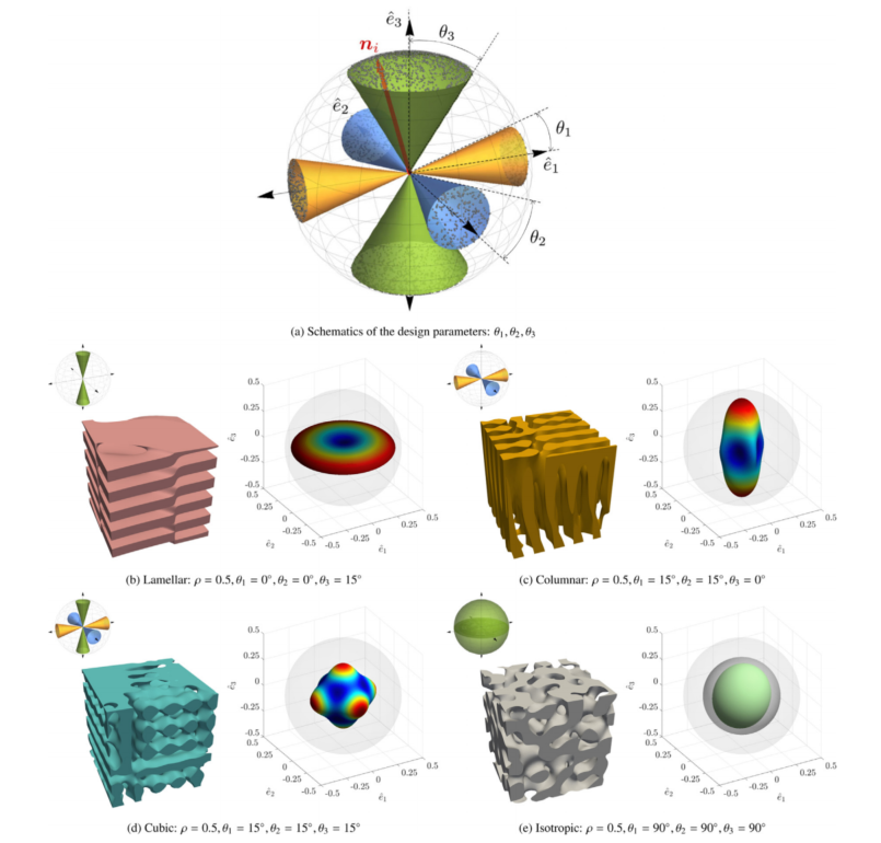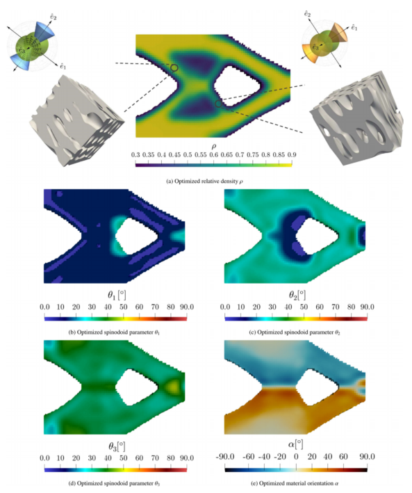 图:基准I:具有棘状微尺度结构的悬臂梁的最佳拓扑结构(材料分布、各向异性和取向)的前视图。空间变化的设计参数在整个机身上进行了说明,(a)中显示了两个不同微尺度拓扑的例子。