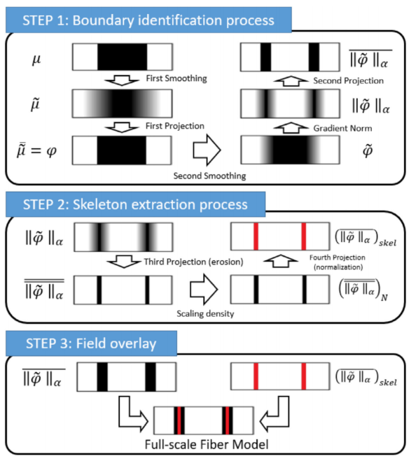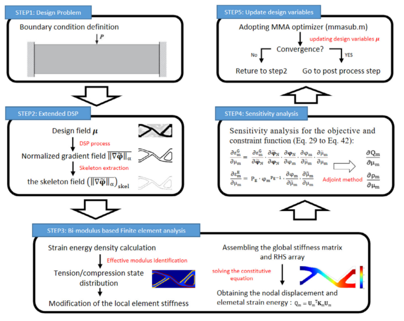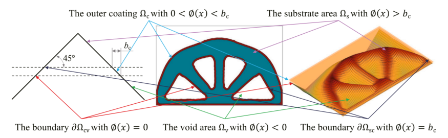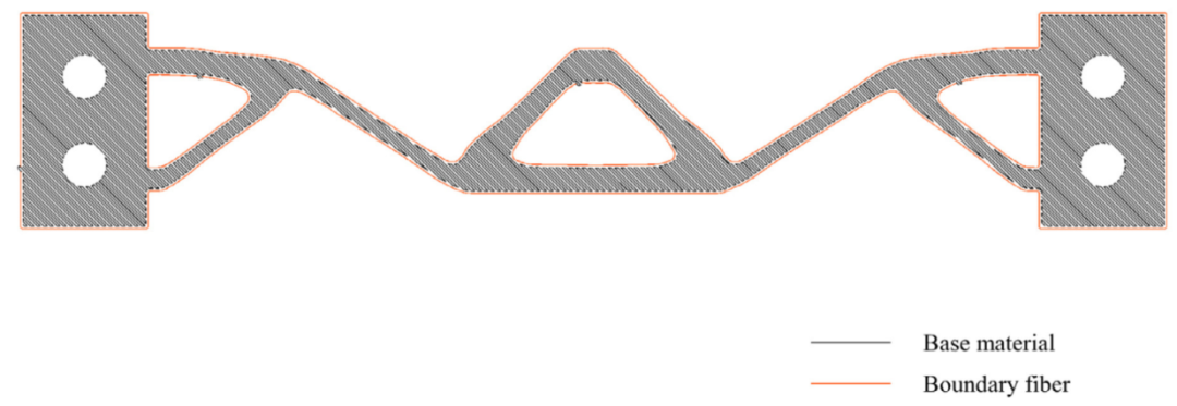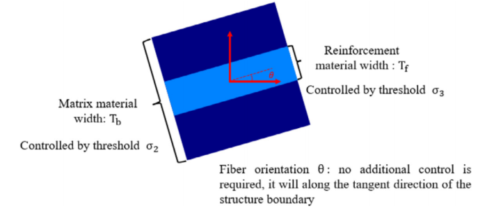 考虑到纤维布局和基材分布的灵活性,增材制造为纤维增强复合材料结构提供了新的设计空间。因此,本研究开发了一种专门用于表面纤维增强设计的拓扑优化方法。靶向部分由增强边界轮廓的纤维成分和填充结构内部的各向同性基底材料组成。重点介绍了纤维含量全尺寸建模的思想和解决双模量加固效应的方法。具体而言,在SIMP框架下,通过双层密度平滑和投影的边界层提取来识别纤维含量(包括纤维材料和包裹基质材料),并通过从边界层提取分析骨架来识别增强纤维材料。以这种方式,对恒定厚度的纤维含量进行建模,更重要的是,将其严格纳入拓扑优化问题的公式中。边界层厚度和纤维增强层厚度都可以通过修改投影阈值参数来明确控制。在当前的研究中考虑了顺应性最小化问题。导出目标函数和约束函数的灵敏度,以指导设计更新。提供了几个数值和实验例子来证明所提出方法的有效性和有效性,特别是揭示了引入边界层纤维对导出拓扑结构的影响。