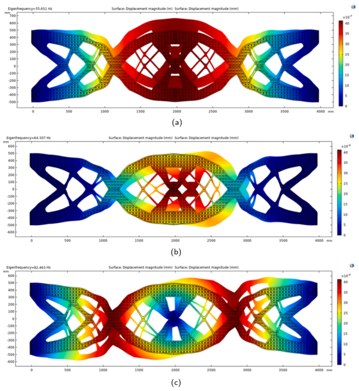 图:优化夹持端梁的本征模形状: (a)第一、(b)第二、(c)第三本征模态。