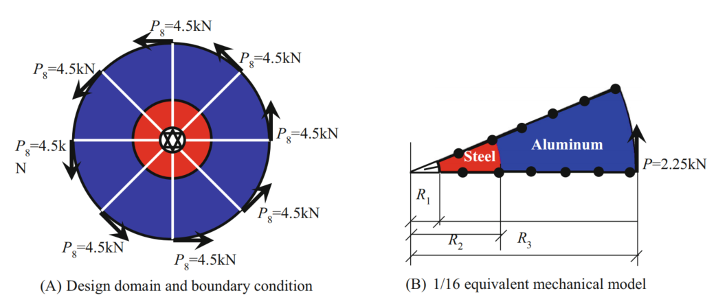 针对同时考虑刚度和强度的双盘系统轻量化设计问题,提出了一种基于独立连续映射(ICM)方法的两阶段拓扑优化框架。首先,建立了拓扑优化公式,以保证优化设计满足关键节点的位移和应力约束。其次,引入信息函数来实现元素和组件之间材料特性的转换。选择复合指数滤波器函数来建立元素属性与相应拓扑设计变量之间的关系。第三,通过灵敏度分析和泰勒展开得到近似显式二次规划模型。在求解过程中,利用对偶理论建立了设计变量较少的近似对偶模型。最后,提出并讨论了一系列双盘系统拓扑优化设计问题,以说明该方法的稳健性和可行性。该研究发现了一些新的扭转双盘设计,也为多组分系统的轻量化拓扑优化提供了一些理论参考。