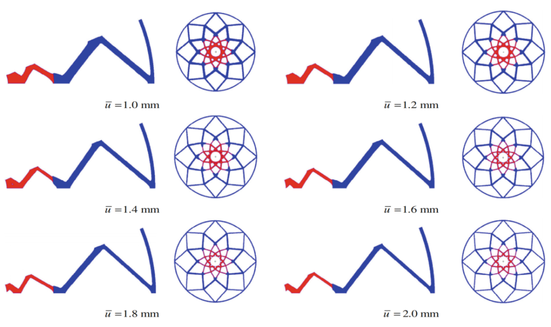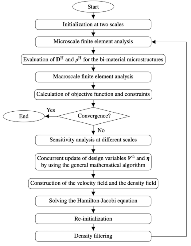 本文提出了一种新的多尺度拓扑设计策略,用于填充逐层双材料晶格微结构的涂层结构,其目标是最小化宏观结构在时谐激励频率下的动态柔度。双材料微观结构的优化与宏观结构的拓扑设计同时进行,以充分考虑两个尺度之间结构演化的相互作用。在宏观尺度上,采用基于速度场的水平集方法对宏观结构的材料分布进行优化,该方法继承了隐式几何表示,可以获得光滑的结构边界。由于符号距离特性,在迭代过程中能够很好地保持外涂层的厚度。对于微观尺度,选择密度法对晶格微观结构进行拓扑优化。涂层结构的网格填充物被设计为分层的,将其均匀(或接近均匀)划分为不同的层,每层都由周期性和均匀的双材料微观结构组成,这可以扩大设计空间,产生各种微观结构图案,以更好地抵抗振动响应。对不同尺度的设计变量进行了动力柔度的灵敏度分析,并通过几个算例研究了划分层数、激励频率、涂层厚度、阻尼系数、单元网格、静态约束和网格填充的划分方向对优化的宏观和微观结构的影响。此外,还构建了计算机辅助设计(CAD)模型的贴体网格,有限元分析结果进一步验证了该方法的有效性。