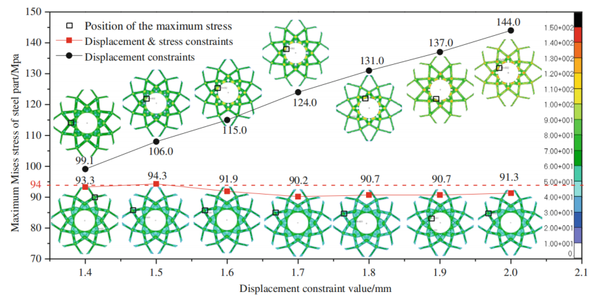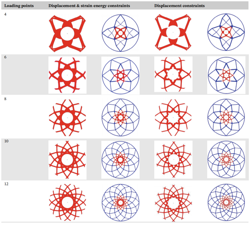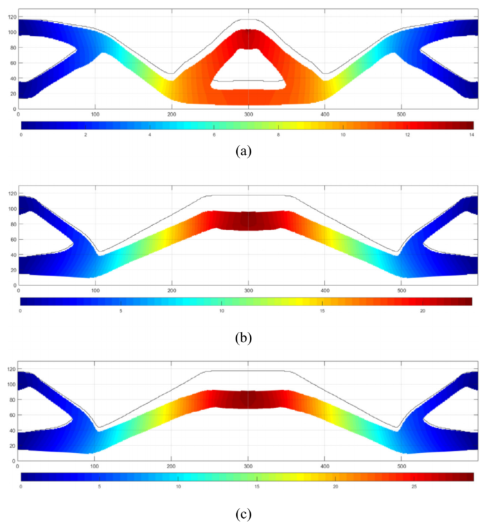 图:(a)双模量边界纤维增强优化结构设计的节点位移分布;对于(b)传统涂层结构的优化设计;以及(c)人工制造的混合设计。