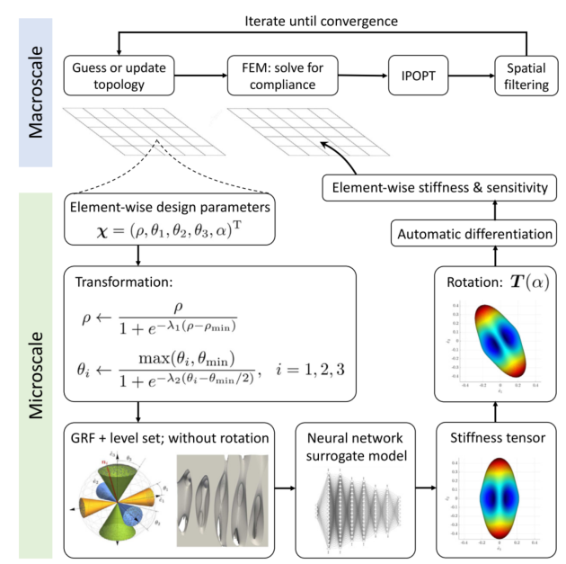 我们提出了一个双尺度拓扑优化框架,用于设计具有优化弹性响应的宏观物体,这是通过微观尺度上的空间可变单元结构实现的。在微观尺度上为细胞网络选择的旋节拓扑结构(其灵感来自于旋节分解过程中形成的自然微观结构)允许无缝的空间分级以及可调的弹性各向异性,并且它由与底层高斯随机场相关的一小组设计参数来参数化。宏观边值问题由有限元离散,有限元除了对位移场进行连续插值外,还对微观设计参数进行连续插值。通过假设尺度分离,宏观尺度上的局部本构行为被识别为基于局部设计参数的微观结构的均匀弹性响应。与经典的FE2型方法不同,我们使用深度神经网络,用数据驱动的代理模型取代了昂贵的微尺度均匀化,该模型准确有效地将设计参数映射到有效弹性张量上。该模型基于有限元数值均匀化后的均匀刚度数据进行训练。作为一个额外的好处,机器学习设置允许自动微分,这样就可以准确地计算灵敏度(优化问题所需的),而不需要数值导数——这一策略的前景远远超出了弹性刚度。因此,该框架为基于数据驱动代理模型的多尺度拓扑优化提供了一个新的机会。
