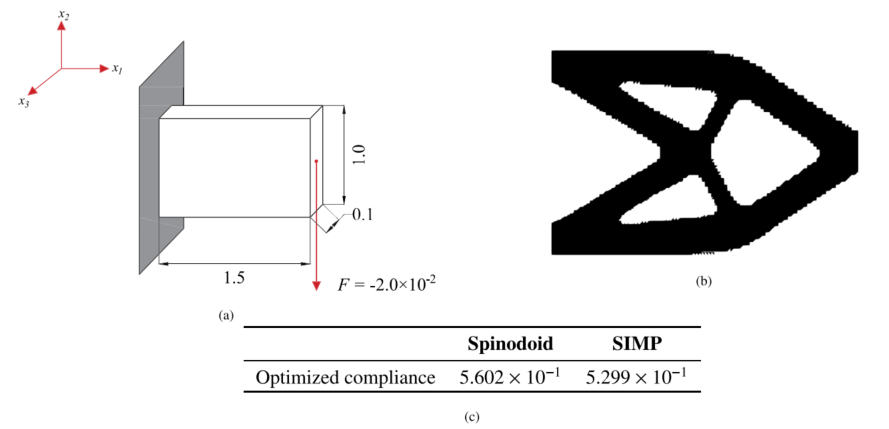 图:基准I:(a)端部加载悬臂梁的示意图,其顺应性有待优化。(b) 使用SIMP方法获得的最优拓扑的前视图。(c) 在微观尺度上(通过所提出的方法)和固体材料(通过SIMP)的旋纹结构的最佳顺应性的比较。