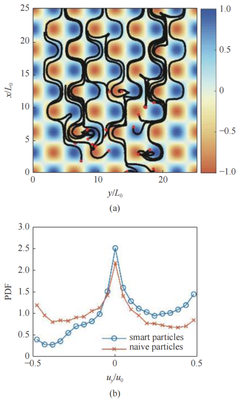 图:(a)智能颗粒在二维Taylor-Green旋涡流动中的运动轨迹。红点表示颗粒的初始位置,背景为涡量云图。(b)智能颗粒与非智能颗粒当地流体垂直方向速度4,的概率密度分布(PDF)