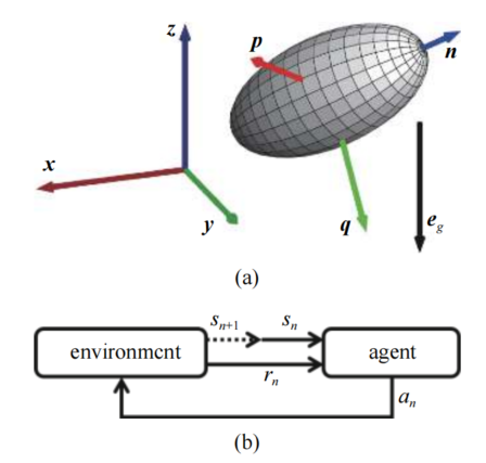 图:(a)智能颗粒示意图。x-y-z为全局坐标系,n-p-q为颗粒局部坐标系。(b)强化学习原理示意图