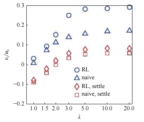 图:智能颗粒垂直运动速度随形状和重力沉降作用的变化。颗粒速度以流动的特征速度无量纲化。RL:强化学习得到的智能策略,naive:简单策略,settle:考虑沉降作用