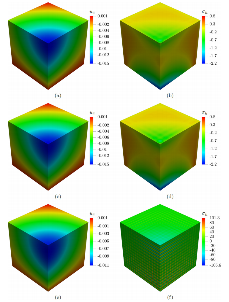 图:压缩体积力下的三维块体。a、 c、e分别使用CAS1、CAS2和CS单元绘制垂直位移。b、 d、f分别使用CAS1、CAS2和CS单元绘制静水应力图。
