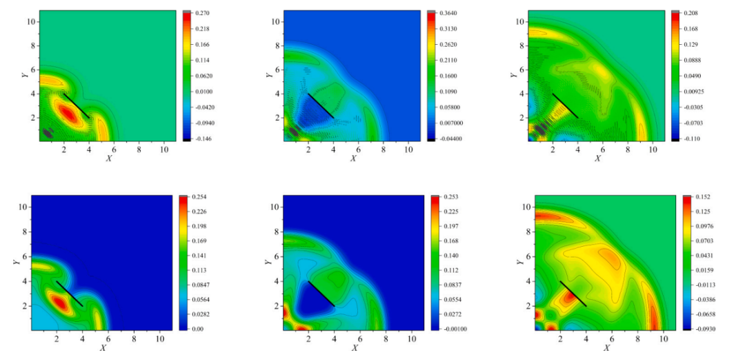 图:不同时刻的 φ 分布。上图: 原始的非常规 TL- 近场动力学,下图: 提出的 TL- 近场动力学与稳定。从左到右: t = [6,8,10] s。