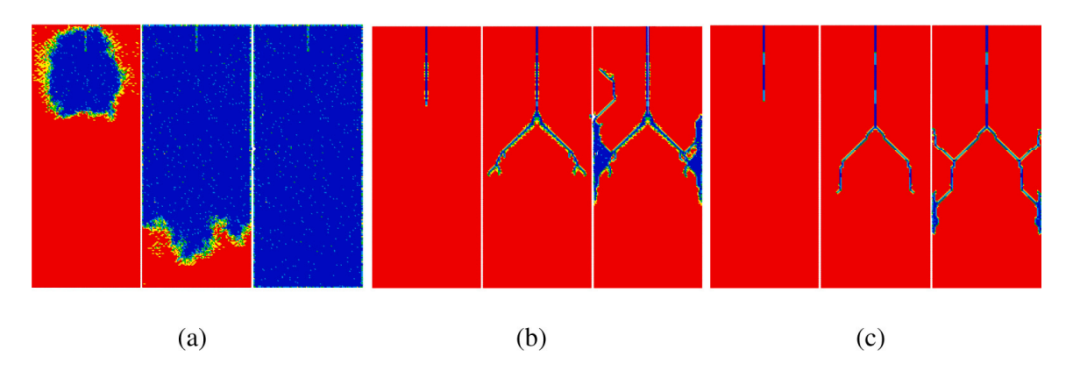 图:裂纹扩展。(a) 原始的非寻常𝑇𝐿-近场动力学,(b)Silling的稳定近场动力学,以及(c)提出的稳定近场动力学。损伤量以蓝色(完全损坏)到红色(未损坏)的颜色显示,表示值递减。