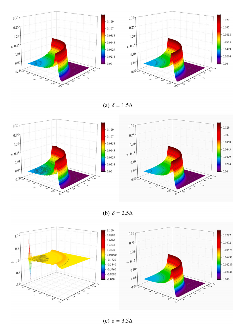 图:T = 10s 的 φ 分布。左: 原始的非常规 TL- 近场动力学,右: 提出的 TL- 近场动力学与稳定。Δ 和 Δ 分别表示圆的视界半径和相邻粒子之间的平均距离。