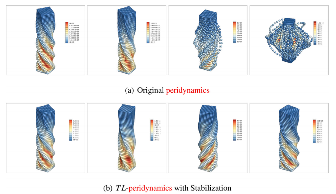 在有和没有稳定的情况下进行了测试计算,结果表明,提出的𝑇𝐿-近场动力学可以显著抑制零能量模式不稳定性,并易于处理大变形。此外,所提出的节能时间步进方法允许长时间模拟。