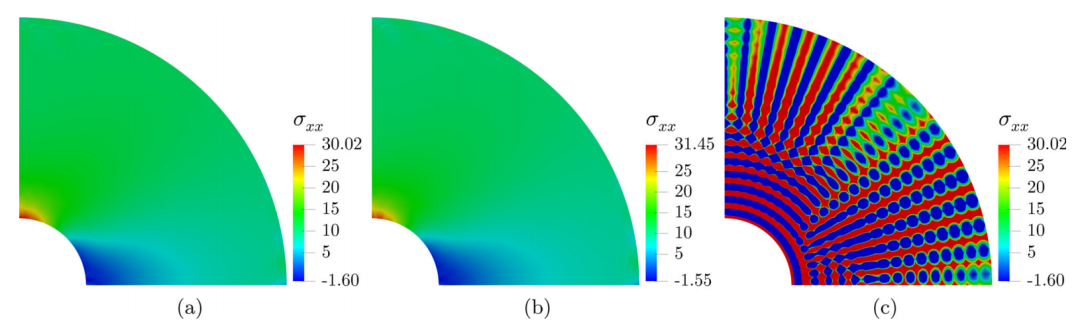 图:受拉带孔无限板。a 使用CAS1单元的x方向法向应力分布。b 使用CAS2单元计算x方向上的法向应力分布。c使用CS单元的x方向法向应力分布。
