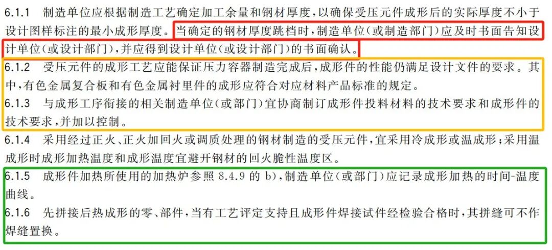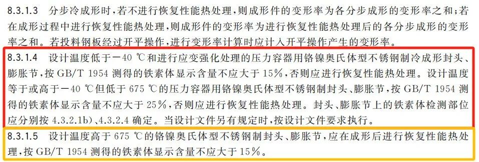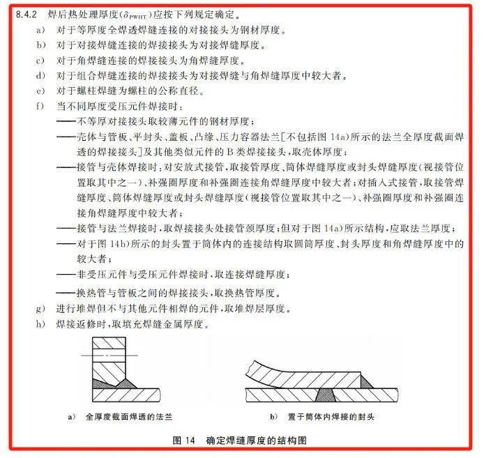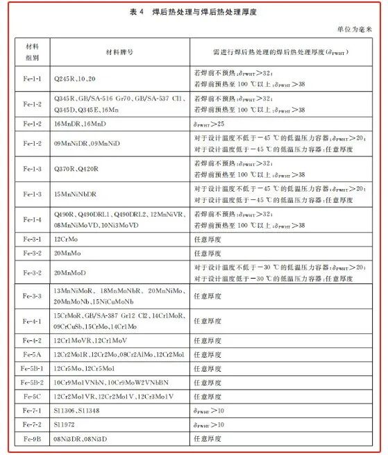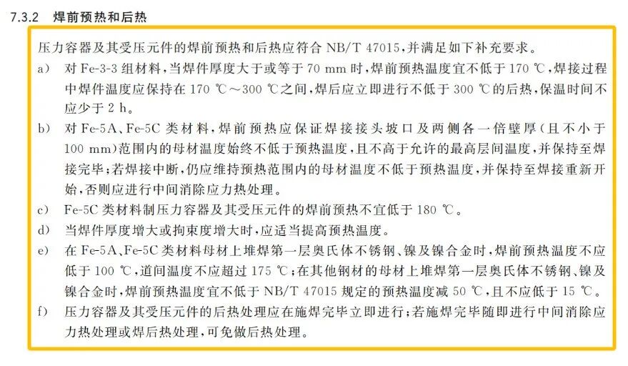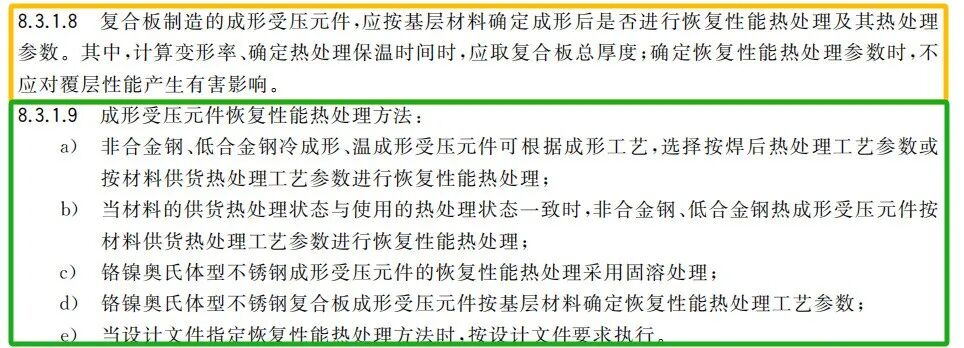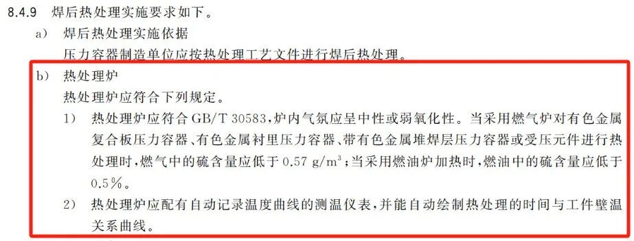 2)增加了对热处理方式的规定(见8.1.2、8.1.3、8.1.4);3)更改了冷成形铬镍奥氏体型不锈钢制封头、膨胀节的合格指标及进行恢复性能热处理的规定(见8.3.1.1、8.3.1.4、8.3.1.5,2011年版的8.1.1);4)增加了复合板制成形件进行恢复性能热处理的规定(见8.3.1.8);5)增加了成形受压元件恢复性能热处理方法的规定(见8.3.1.9);6)更改了确定焊后热处理厚度的规定(见8.4.2、表4,2011年版的8.2.1、表5);7)增加了确定复合板焊接接头是否进行焊后热处理的规定(见8.4.5);8)增加了对采用降低保温温度、延长保温时间的热处理工艺时最大降温幅度的规定[见 8.4.7的a)];9)增加了确定复合板压力容器及其受压元件焊后热处理保温温度、保温时间的规定[见 8.4.7的b)];10)增加了对复合板压力容器、衬里压力容器及其受压元件焊后热处理时机的规定(见 8.4.8);11)增加了对焊后热处理炉的规定[见8.4.9的b];12)增加了对测温点布置的补充规定[见8.4.9的c];13)更改了对炉内热处理操作的规定(见8.4.9的d),2011年版的8.2.7.1]。