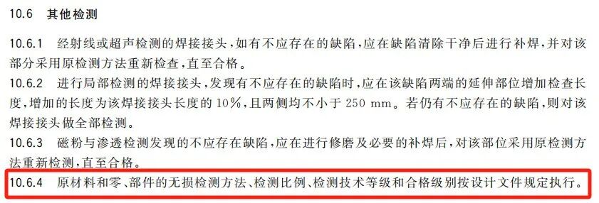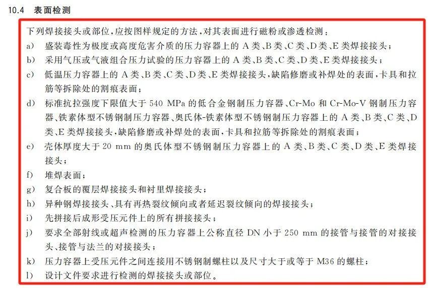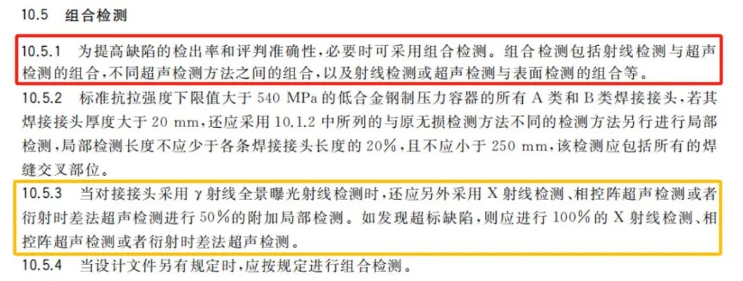 1)更改了对无损检测方法的规定,增加了射线数字成像检测(DR)、射线计算机辅助成像检测(CR)和相控阵超声检测(PAUT)等三种无损检测方法(见10.1.1、10.1.2,2011年版的 10.1.1);2)更改了对不可记录脉冲反射法超声检测进行附加局部检测的规定(见10.1.3,2011年版 的10.1.2);3)更改了拼接封头无损检测实施时机的规定(见10.2.2,2011年版的10.2.2);4)增加了对复合板压力容器、带堆焊层压力容器、衬里压力容器无损检测实施时机的规定 (见10.2.5、10.2.6、10.2.7);5)更改了进行全部射线或超声检测的规定(见10.3.1,2011年版的10.3.1);6)更改了进行局部射线或超声检测的规定(见10.3.2,2011年版的10.3.2);7)增加了对插入式接管和安放式接管与筒体、封头之间焊接接头的无损检测要求(见 10.3.3);8)更改了对焊接接头进行表面检测的规定(见10.4,2011年版的10.4);9)增加了对采用不同无损检测方法进行组合检测的确定原则及其组合方式的规定(见 10.5.1);10)增加了对采用γ射线全景曝光射线检测进行附加局部检测的规定(见10.5.3);11)增加了对原材料和零、部件进行无损检测的相关规定(见10.6.4);