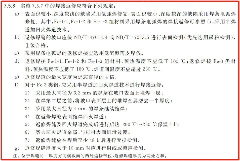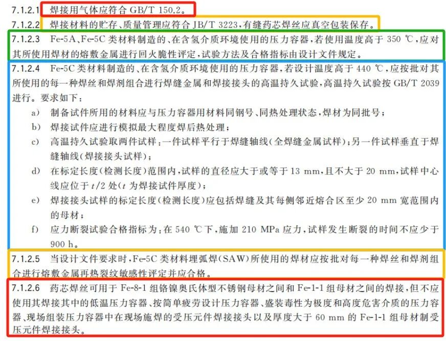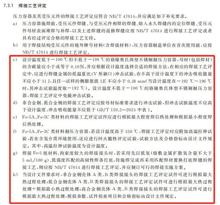 1)更改了对施焊环境的规定(见7.1.1,2011年版的7.1.2);2)增加了对有色金属衬里件的施焊环境要求(见7.1.1.3);3)增加了对焊接用气体的规定(见7.1.2.1);4)更改了对焊接材料贮存、管理的规定(见7.1.2.2,2011年版的7.1.1);5)增加了对Fe-5A、Fe-5C类材料用焊材熔敷金属进行回火脆性评定的规定(见7.1.2.3);6)增加了对Fe-5C类材料进行焊缝金属和焊接接头高温持久试验的规定及相关要求(见 7.1.2.4);7)增加了对Fe-5C类材料埋弧焊用焊材进行熔敷金属再热裂纹敏感性评定的规定(见 7.1.2.5);8)增加了药芯焊丝适用范围的规定(见7.1.2.6);9)增加了对焊件清理与保护的规定(见7.1.3);10)增加了对焊接压力容器所使用的焊接方法的规定(见7.2);11)更改了设计温度低于一100℃但不低于-196℃的铬镍奥氏体型不锈钢制压力容器焊 接工艺评定中的冲击试验合格指标(见7.3.1的c)];12)增加了对非合金钢、低合金钢焊接工艺评定中冲击试验的要求[见7.3.1的d]];13)增加了Fe-5A、Fe-5C类材料的焊接工艺评定试件进行模拟最大程度焊后热处理和模拟 最小程度焊后热处理的规定[见7.3.1的e]];14)增加了Fe-5A、Fe-5C类材料的焊接工艺评定进行附加高温拉伸试验、回火脆性评定试 验的规定[见7.3.1的f];15)增加了对Fe-3组材料打底焊缝采用焊材置换时进行焊接工艺评定的规定[见7.3.1的 g)];16)增加了焊接工艺评定试件进行模拟最大热过程处理、模拟最小热过程处理的规定[见 7.3.1的h)];17)增加了焊接预热和后热的规定(见7.3.2);18)增加了对药芯焊丝使用、保存的要求(见7.3.3.2);19)增加了对堆焊层、覆层焊缝焊接的要求(见7.3.3.3);20)增加了对焊接引弧、电弧擦伤修磨的规定(见7.4.5);21)更改了压力容器焊接返修后需重新进行热处理范围的规定(见7.5.6、7.5.7,2011年版的 7.4.3、7.4.4);22)增加了压力容器不重新进行热处理时焊接返修的规定(见7.5.8);