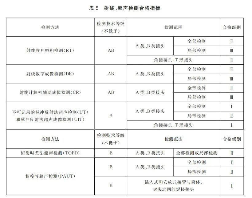 12)更改了射线、超声检测合格指标(见表5,2011年版的表6)。