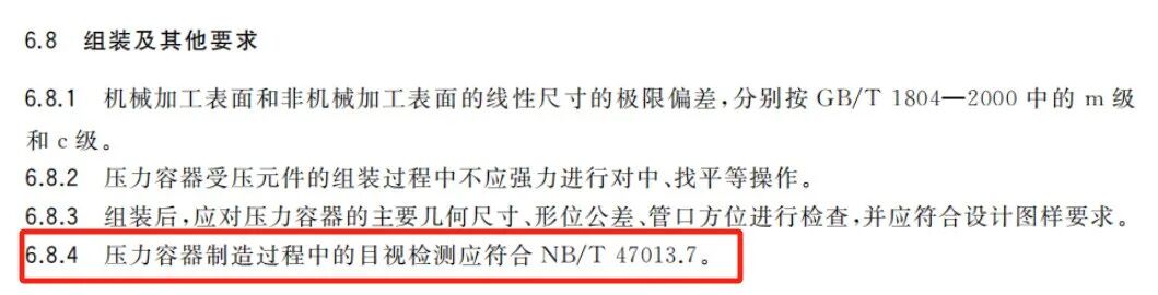 6)增加了不带顶圆板的先分瓣成形后组装封头的相关规定(见6.4.2);7)更改了对大直径封头进行形状检查使用工具的规定(见6.4.4,2011年版的6.4.2);8)增加了对采用单面或双面削薄厚板边缘的方法进行组装的壳体应满足设计强度要求的规 定(见6.5.3);9)增加了对复合板压力容器、衬里压力容器、带堆焊层压力容器基层组装对齐方式和复合板压力容器、衬里压力容器中衬里件组装对齐方式的要求[见6.5.5的a]];10)增加了对压力容器制造过程中目视检测的规定(见6.8.4)。